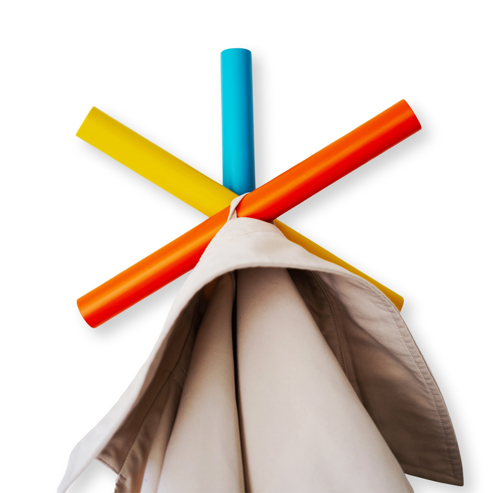 A study in elegant simplicity, the Logs Coat Rack resembles a minimalist sculpture. It’s composed of three solid beech wood rods crossed in a star formation, offering two long pegs for hanging your accessories. Use it to hang coats, jackets, scarves, ties, dog leashes, hats and more. A great coat rack solution for smaller spaces. Attaches easily to your wall (hardware included). The Logs Coat Rack is sustainably made from quality wood offcuts leftover from the production of chairs. It measures 10h x 9w x 3.7"d.