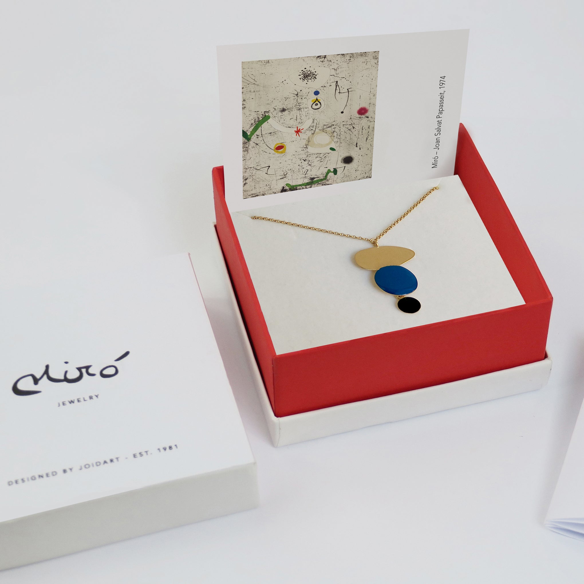 The Joan Miró Gold-Plated Linear Dots Necklace is a prime example of just how well the artist’s vision translates to wearable jewelry. Made by family-owned Spanish brand Joidart in collaboration with Successió Miró, this design features 24k gold-plated metal and enamel irregular circles taken from the 1974 artwork Papasseit. Wear it solo as an artful finishing touch or pair it with coordinating earrings from the same collection to create more impact. Every piece is conscientiously and locally made at a small factory in a mountain village using traditional artisanal techniques. The Joan Miró Gold-Plated Linear Dots Necklace has a pendant that measures 1.25l x 0.79”w and a chain that measures 16.5”l with a 1.5”l extender chain. Miró’s work is represented in MoMA’s collection.