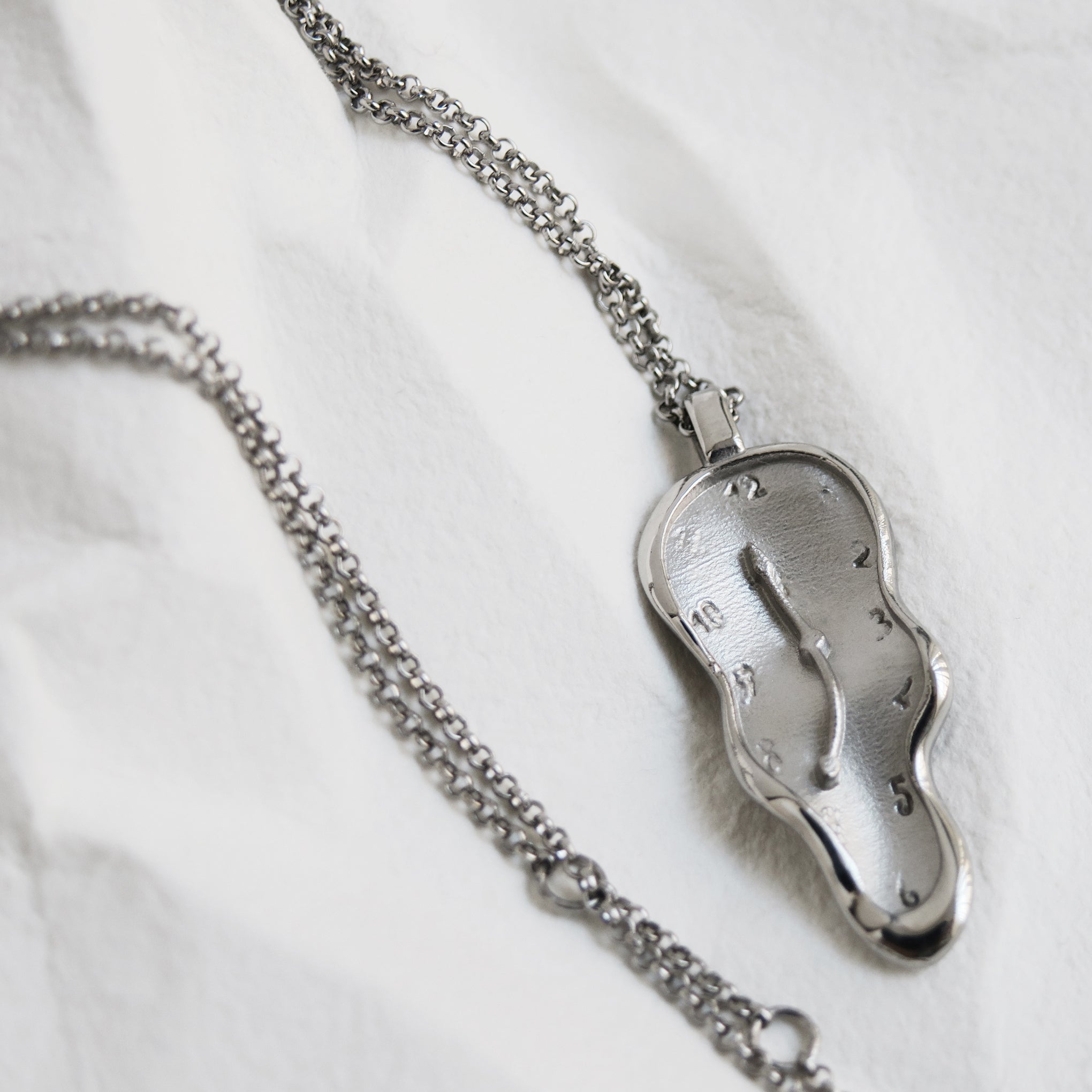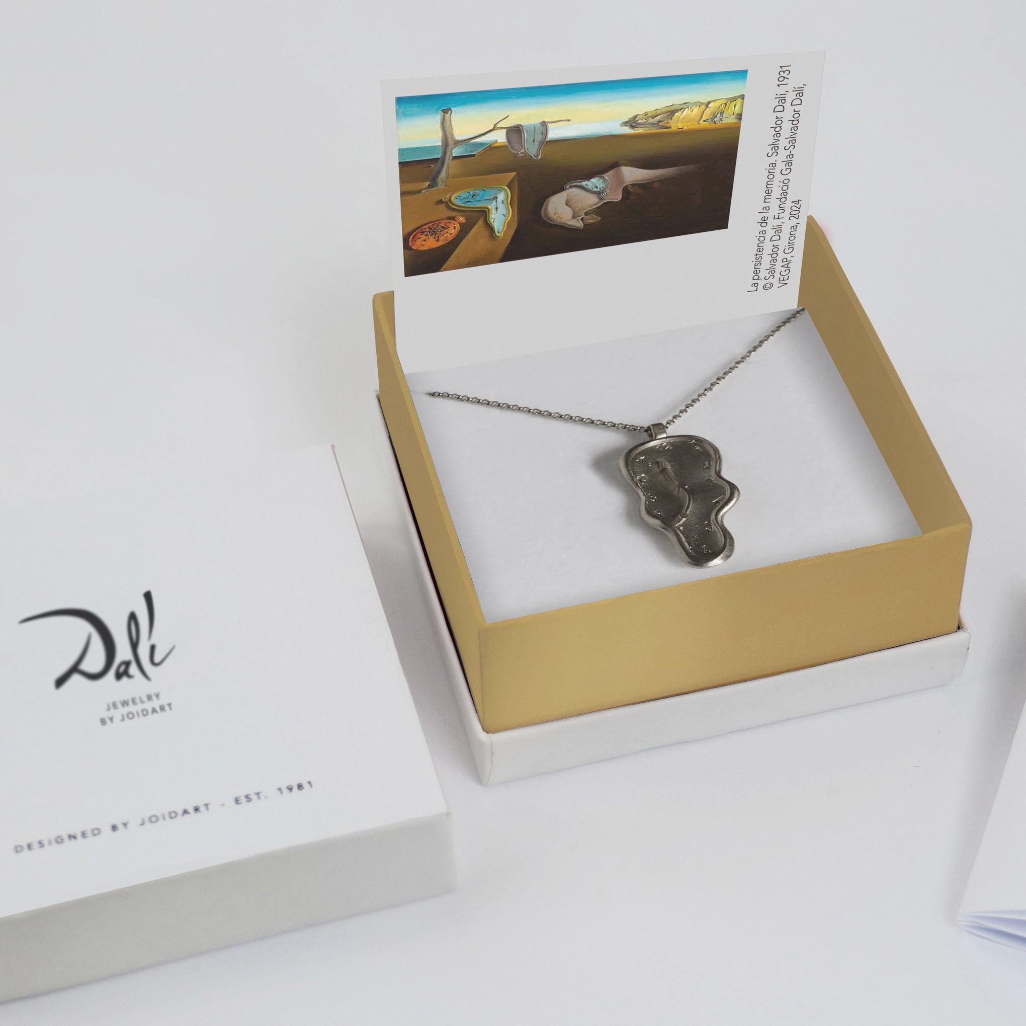 This Sterling Silver Melting Clock Necklace is inspired by the symbolic elements of artist Salvador Dalí’s The Persistence of Memory (1931) work in MoMA’s collection. It features a pendant in the shape of a limp watch which the artist once described as “the camembert of time,” a comparison to soft, overripe cheese. Designed by Barcelona-based, family-owned jewelry brand Joidart, this platinum-plated silver piece can be worn solo to make a subtle surrealist statement or teamed with the matching earrings for a bit more impact. Salvador Dalí Sterling Silver Melting Clock Post Necklace has a pendant that measures 1.25l x 0.50"w with a chain measuring 16.5"l, and a 1.5”l extender chain.
