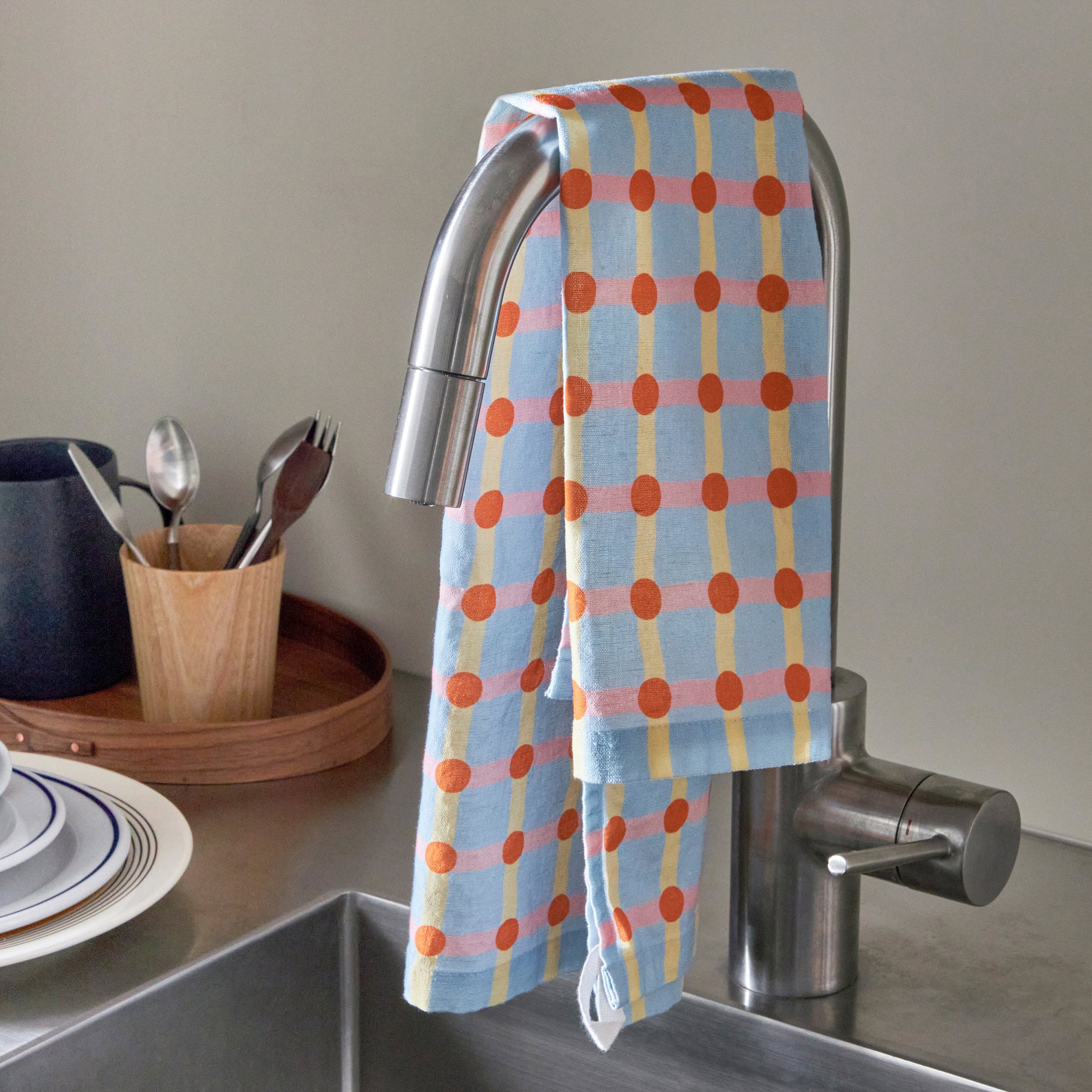 Bright, graphic and useful, this Dot Check Tea Towel has a variety of uses, from kitchen spot-cleaning to meal presentation. Made from 55% linen and 45% cotton, the Dot Check Tea Towel measures 23.6l x 17.7"w. Machine wash cold, tumble dry low.