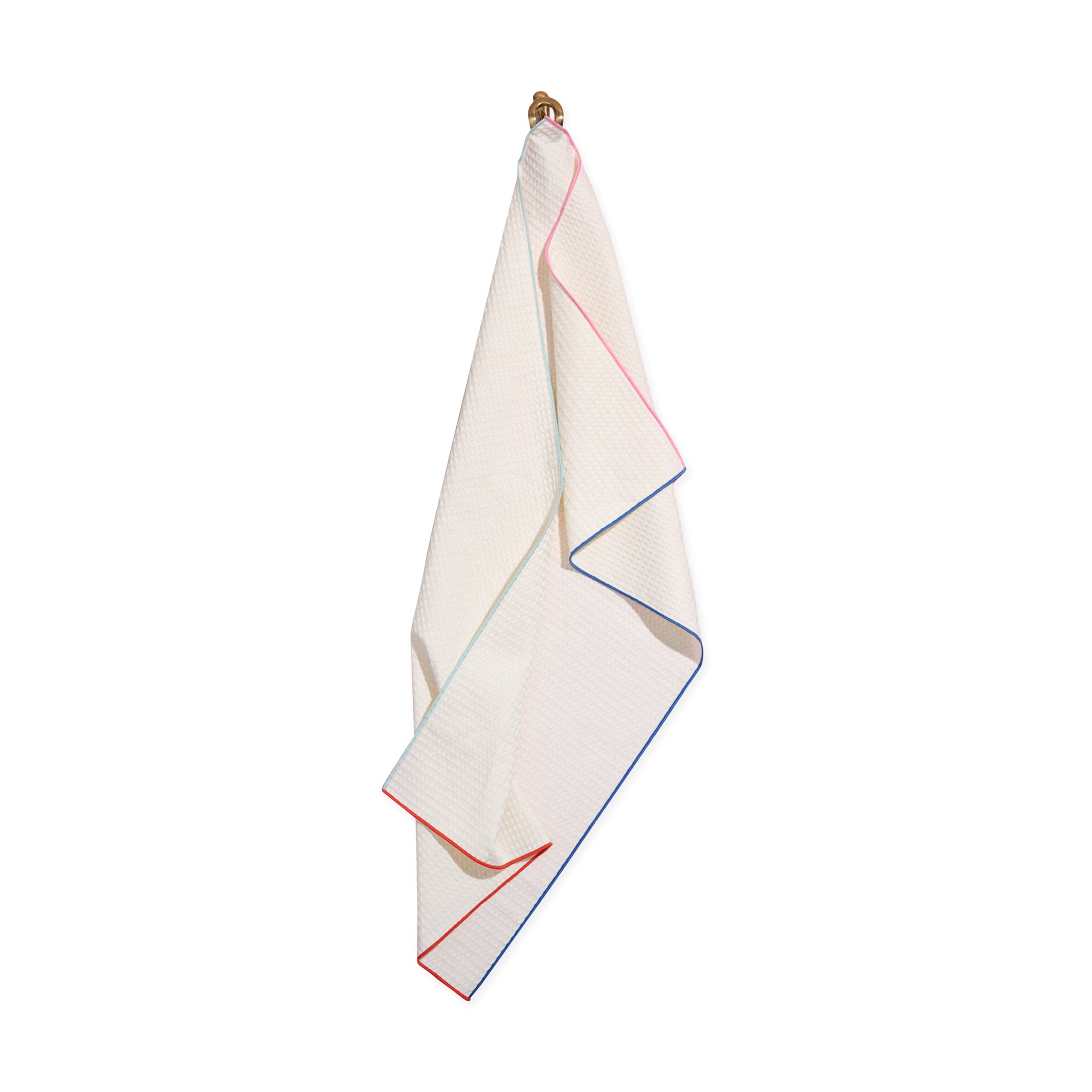 Switch out your drab tea towels for these freshly colored designs that are handcrafted from 100% premium reclaimed fabric in Los Angeles. This set includes two absorbent waffled towels, one in taffy pink, the other in buttercream, with tropical color-blocked trim. A heavyweight cotton loop ensures easy hanging and quick drying after daily kitchen duties. Each Sugar Rush Reclaimed Fabric Tea Towel measures 30l x 18”w. To care, wash cold, hang dry and press with low iron while damp.